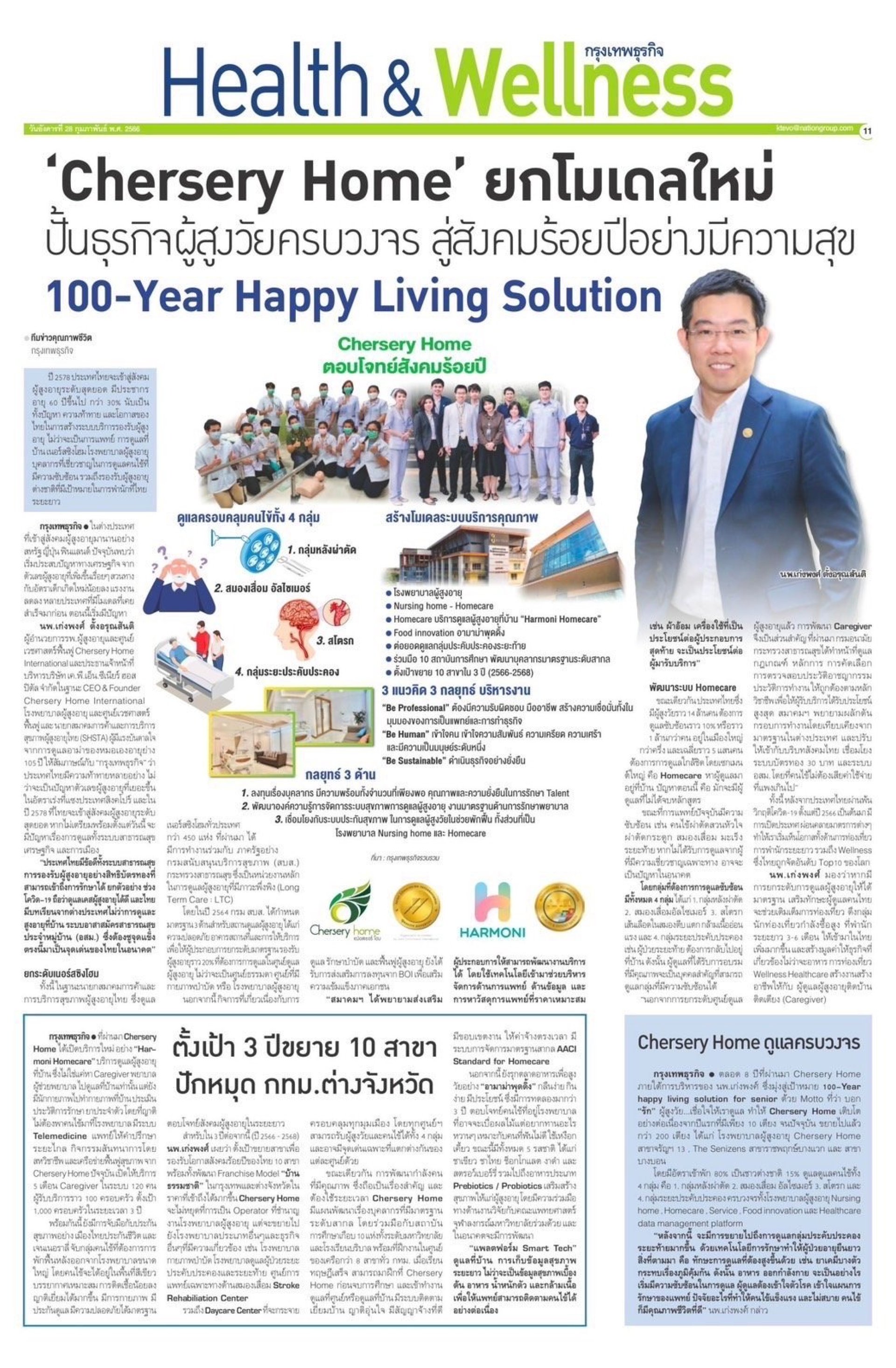 ที่ผ่านมา Chersery Home ได้เปิดบริการใหม่ อย่าง "Harmoni Homecare" บริการดูแลผู้สูงอายุที่บ้าน ซึ่งไม่ใช่แค่หา Caregiver พยาบาล ผู้ช่วยพยาบาล ไปดูแลที่บ้านเท่านั้น แต่ยังมีนักกายภาพไปทำกายภาพที่บ้าน ประเมินประวัติการรักษา ยาประจำตัว โดยที่ญาติไม่ต้องพาคนไข้มาที่โรงพยาบาล อีกทั้งมีระบบ Telemedicine แพทย์ให้คำปรึกษาระยะไกล กิจกรรมสันทนาการโดยสหวิชาชีพ และเครือข่ายฟื้นฟูสุขภาพ จาก Chersery Home ปัจจุบัน เปิดให้บริการ 5 เดือน Caregiver ในระบบ 120 คน ผู้รับบริการราว 100 ครอบครัว ตั้งเป้า 1,000 ครอบครัวในระยะเวลา 3 ปี