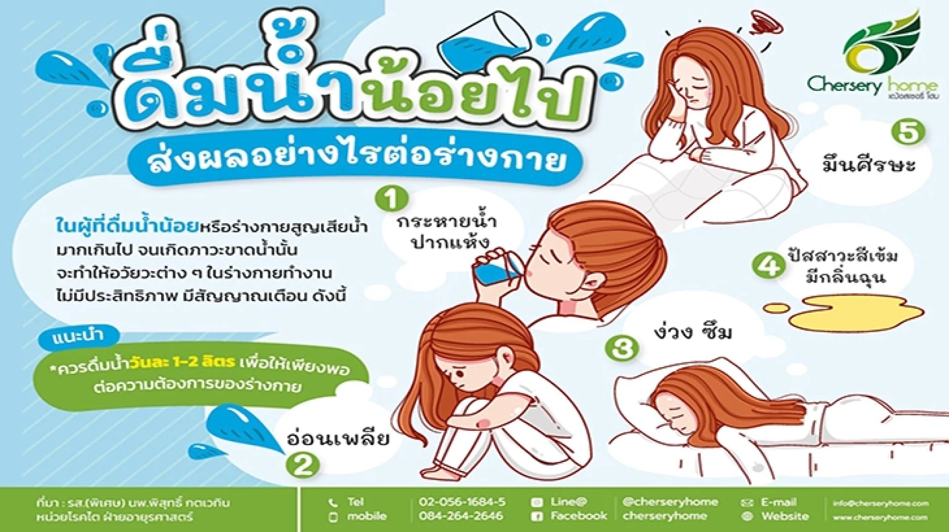 - ผู้สูงอายุ : มักไม่ทราบว่าตัวเองกระหายน้ำ หรือมีโรคประจำตัวที่เกี่ยวข้อง