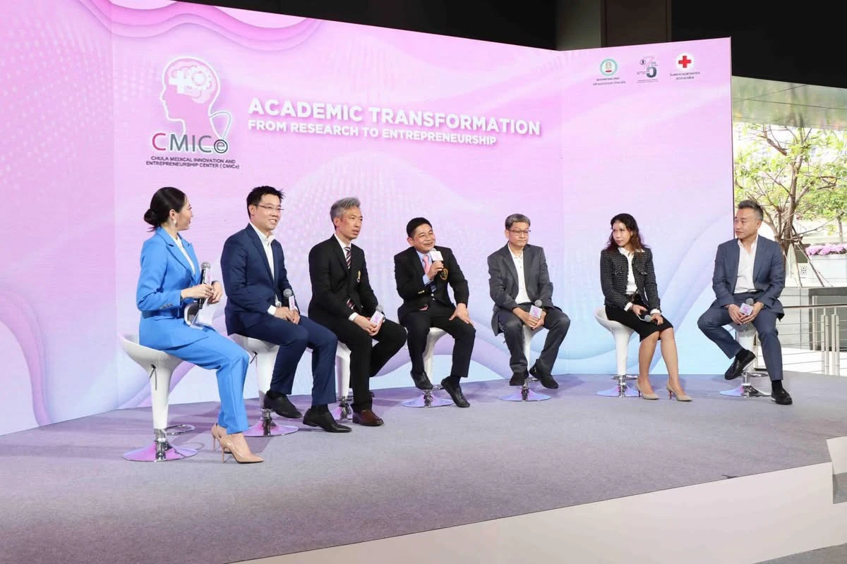 บรรยากาศการพูดคุยในฐานะผลงานจากศูนย์นวัตกรรมทางการแพทย์และการประกอบการ คณะแพทยศาสตร์ จุฬาฯ