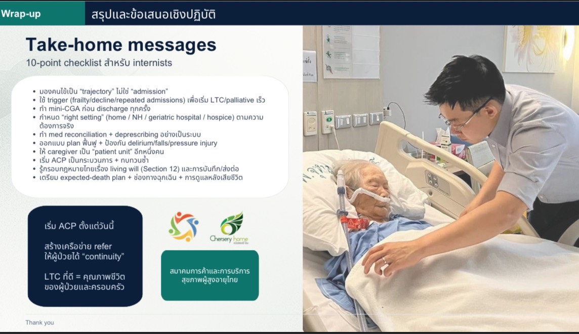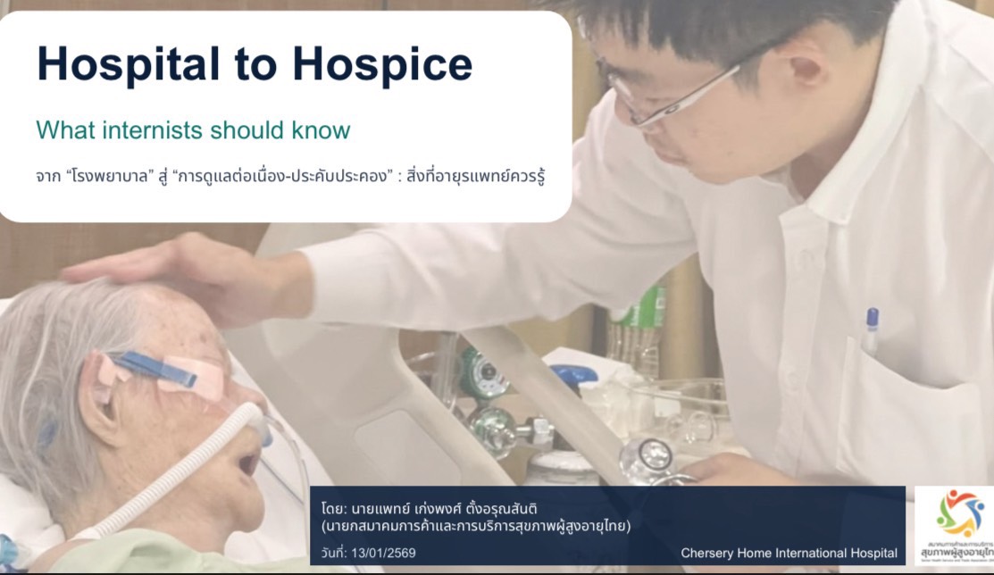 ขอขอบพระคุณ รศ.นพ. ฉันชาย สิทธิพันธุ์ อดีตคณบดีคณะแพทยศาสตร์ จุฬาลงกรณ์มหาวิทยาลัย และภาควิชาอายุรศาสตร์ คณะแพทยศาสตร์ จุฬาลงกรณ์มหาวิทยาลัย รวมถึงศูนย์ชีวภิบาล โรงพยาบาลจุฬาลงกรณ์สภากาชาดไทยที่ได้ให้โอกาสและเกียรติอย่างสูงยิ่ง ในโอกาสที่นพ.เก่งพงศ์ ตั้งอรุณสันติ อายุรแพทย์ ผู้อำนวยการรพ.ได้มาแบ่งปันประสบการณ์ในการพัฒนางานการดูแลผู้สูงอายุต่อเนื่องและการดูแลประคับประคอง Palliative care ผ่านงานของโรงพยาบาลผู้สูงอายุ Chersery Home International และงานของสมาคมฯ ในวันนี้เป็นเป็นอย่างยิ่ง
